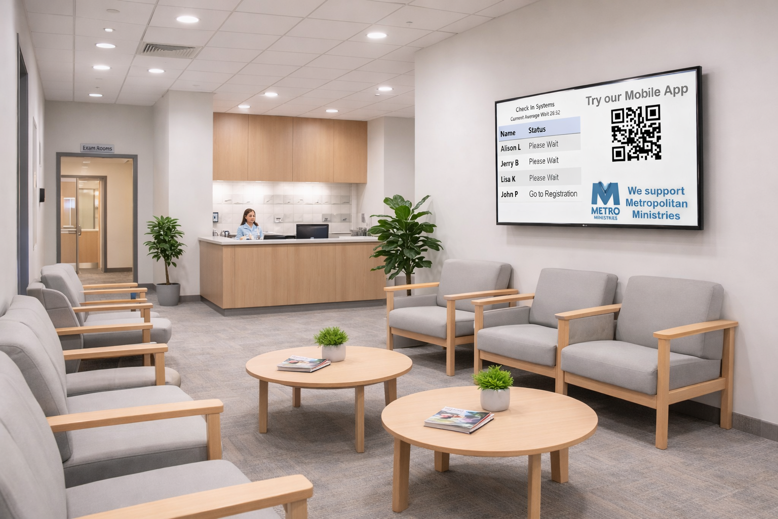 Our lobby TV display is designed to help patients understand where they are in line and to give instructions for those systems using the stations feature. The stations feature allows staff to designate where they are sitting and then call the awaiting patient to a window or station. Much like you may have seen in a DMV office, the stations feature can call a patient to a window. On the TV display a patient will see thier status such as 'Waiting'. Once a staff member clicks acknowledge, the line with the patients abbreviated name will show 'Please see Window 1' in red. It can also be connected to a pa system to have a voice call out for the patient.